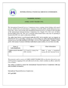 The International Financial Services Commission of Belize (“IFSC”) issues warnings about dealing with named persons, whether these are individuals or companies, to alert the public and the financial services sector that, where such persons offer international financial services as defined in the Schedule of the International Financial Services Commission Act, Chapter 272 of the Laws of Belize, Revised Edition 2011 ( the “IFSC Act”), from the address listed below, they may be operating in breach of the IFSC Act and/or other laws of Belize.