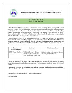 The International Financial Services Commission of Belize (“IFSC”) issues warnings about dealing with named persons, whether these are individuals or companies, to alert the public and the financial services sector that, where such persons offer international financial services as defined in the Schedule of the International Financial Services Commission Act, Chapter 272 of the Laws of Belize, Revised Edition 2011 ( the “IFSC Act”), from the address listed below, they may be operating in breach of the IFSC Act and/or other laws of Belize.