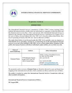 The International Financial Services Commission of Belize (“IFSC”) issues warnings about dealing with named persons, whether these are individuals or companies, to alert the public and the financial services sector that, where such persons offer international financial services as defined in the Schedule of the International Financial Services Commission Act, Chapter 272 of the Laws of Belize, Revised Edition 2011 ( the “IFSC Act”), from the address listed below, they may be operating in breach of the IFSC Act and/or other laws of Belize.