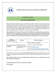 The International Financial Services Commission of Belize (“IFSC”) issues warnings about dealing with named persons, whether these are individuals or companies, to alert the public and the financial services sector that, where such persons offer international financial services as defined in the Schedule of the International Financial Services Commission Act, Chapter 272 of the Laws of Belize, Revised Edition 2011 ( the “IFSC Act”), from the address listed below, they may be operating in breach of the IFSC Act and/or other laws of Belize.