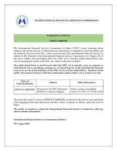 The promoters and/or owners of STEVE S. NORTON are therefore directed to cease and desist from engaging in the said unlicensed activities, which constitute an offence under the Laws of Belize.